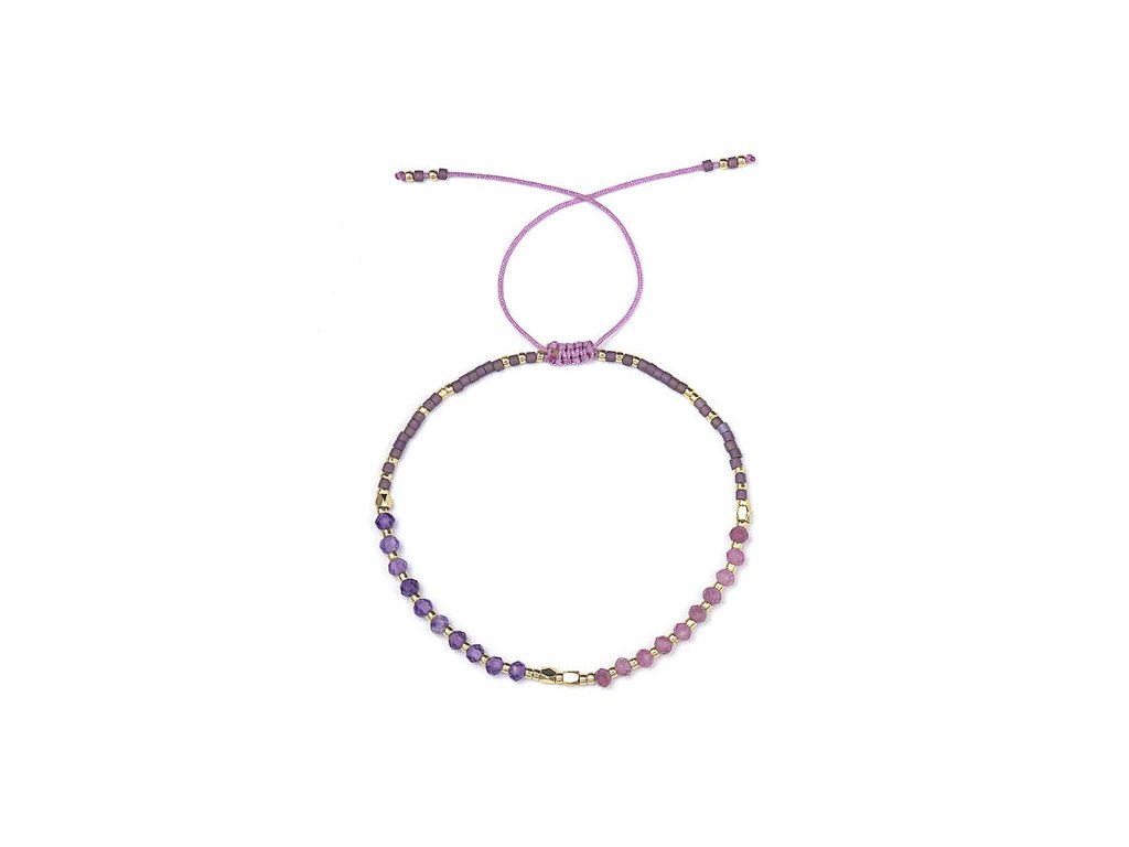 Elegantní náramek z ametystu, růžového turmalínu a japonských Miyuki korálků v jemně růžovo-fialovém provedení. Spojuje ženskost, harmonii a duchovní ochranu. Díky posuvnému drhanému zapínání perfektně padne na každou ruku.