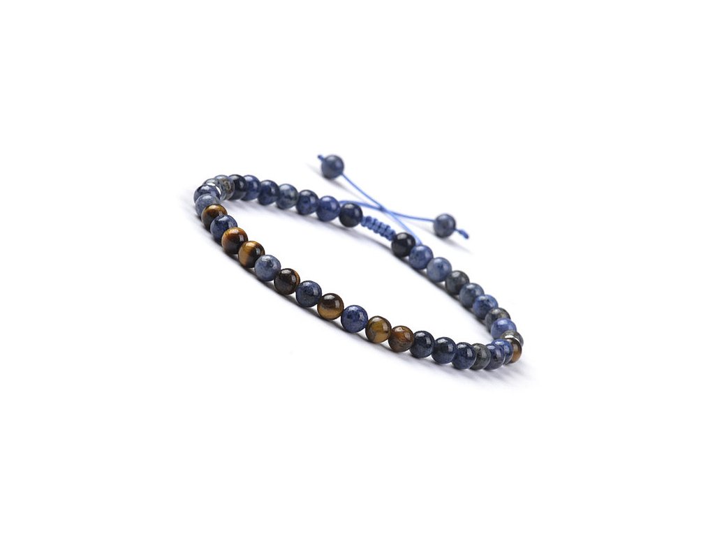 Tento náramek propojuje dva silné minerály – duchovní dumortierit a ochranitelské tygří oko. Kombinace modré a zlatohnědé vytváří jedinečný kontrast, který symbolizuje rovnováhu mezi rozumem a odvahou.