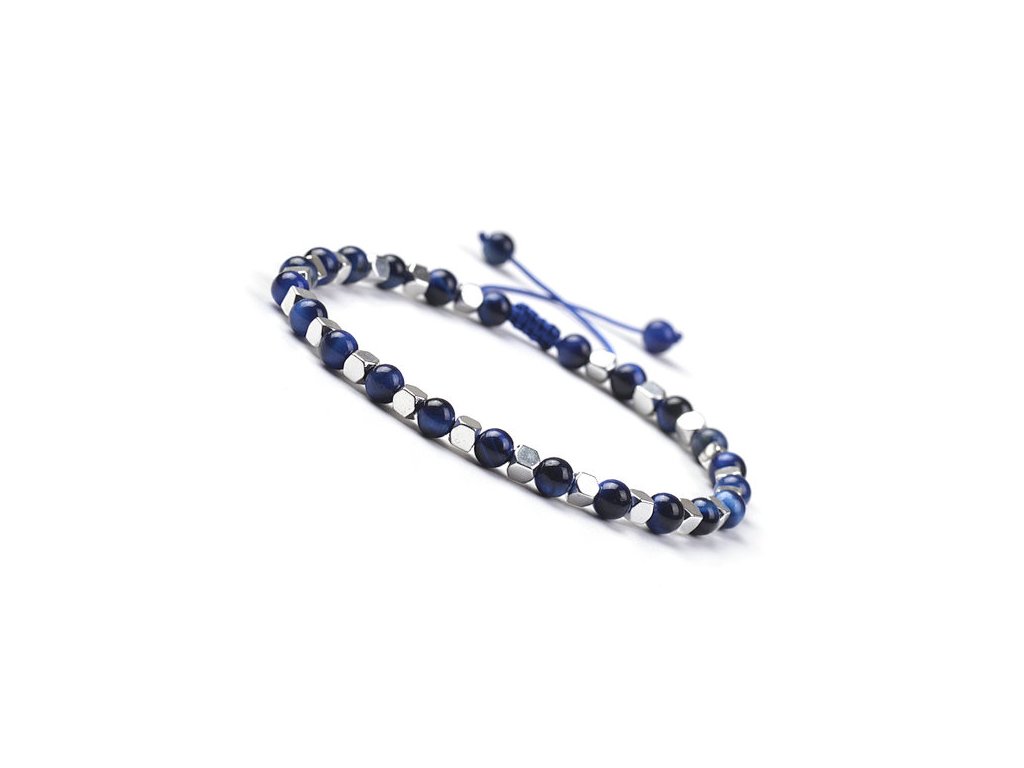 Stylový náramek z modrého tygřího oka a hematitu v kombinaci modrostříbrného designu. Symbol ochrany, klidu a vnitřní síly. Díky ručně drhanému zapínání se snadno přizpůsobí každému zápěstí.