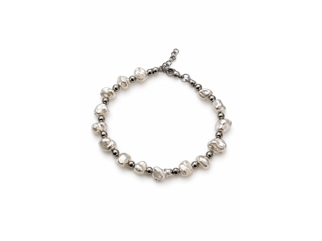 Elegantní perlový náramek ve stříbrném provedení, který spojuje nadčasovou krásu perel s moderní odolností chirurgické oceli. Nepravidelné perly dodávají šperku přirozenost a autenticitu, stříbrné ocelové komponenty podtrhují jeho jemný, ale luxusní charakter.