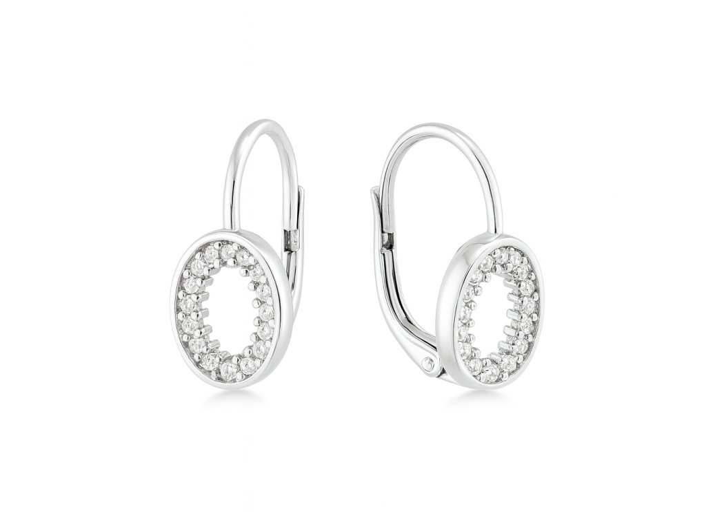 Elegantní stříbrné náušnice s oválným designem zdobeným drobnými čirými zirkony a zapínáním na dámský patent.
